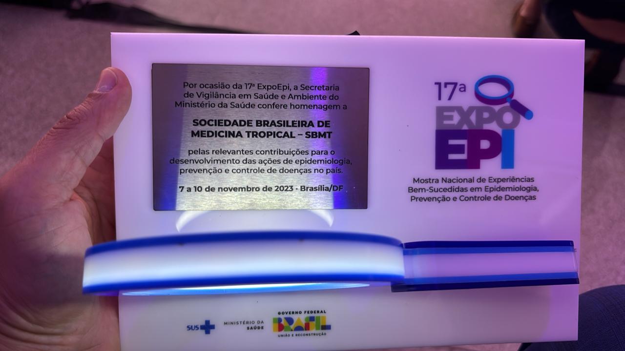 Na noite de terça-feira, 07 de novembro, a Sociedade Brasileira de Medicina Tropical (SBMT) foi homenageada na cerimônia de abertura da 17ª ExpoEpi pelas relevantes contribuições para o desenvolvimento das ações de epidemiologia, prevenção e controle de doenças no País.