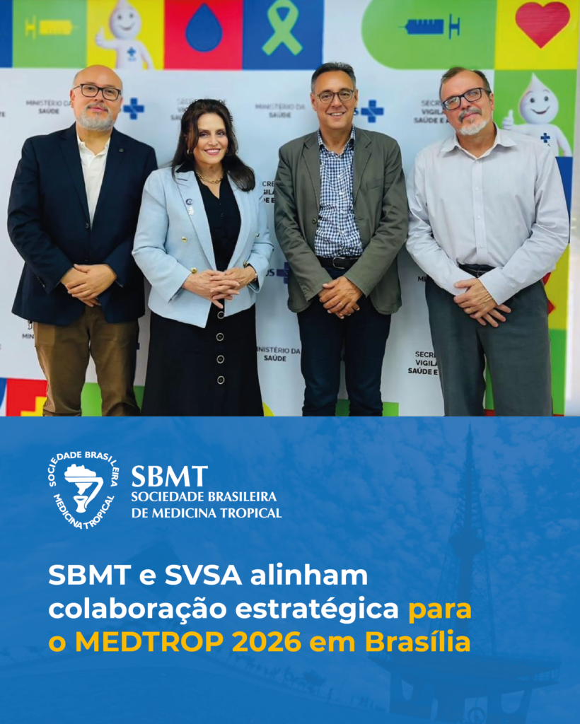 O encontro teve como objetivo fortalecer o diálogo entre a SBMT e o Ministério da Saúde e discutir a integração de temas estratégicos da vigilância em saúde à programação científica do MEDTROP 2026, que será realizado em Brasília (DF), no Centro de Convenções Ulysses Guimarães, entre os dias 16 e 19 de agosto de 2026.